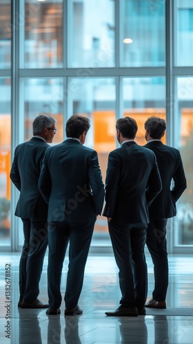 Businessmen looking out of large window. Contemplating the future, strategizing, or simply enjoying a break. A moment of reflection or observation.