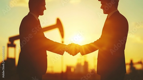 Businessmen Shaking Hands at Sunset with Oil Rigs in the Background