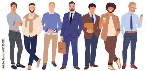 Businessmen team. Vector illustration of diverse standing cartoon men in office outfits. Isolated on white.