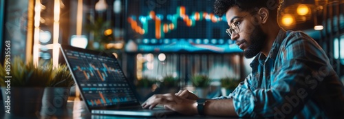 Businessmen use laptops to view charts of the stock market or financial data on a virtual screen while holding coins against an office background with a blurred bokeh effect