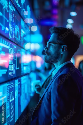 Businesspeople analyzing data, large blue data screens, focused atmosphere, dim lighting, wide shot