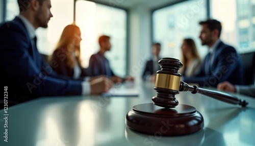 Businesspeople gather in boardroom for important meeting. Gavel sits on table. Decision-making process in progress. Pro atmosphere. Potential legal consultation negotiation. Strategic planning
