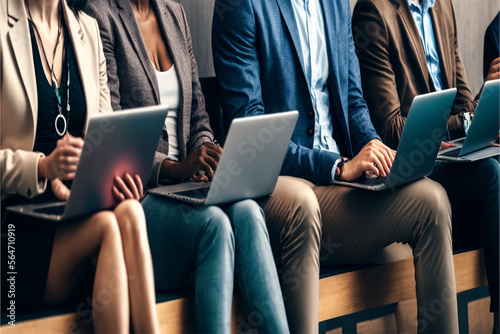 Businesspeople in a row with computer / laptop / tablet.. (AI Generated)