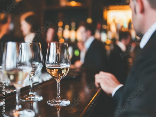 Businesspeople network at a conference, conversing near a bar with wine glasses. The atmosphere is professional and social.