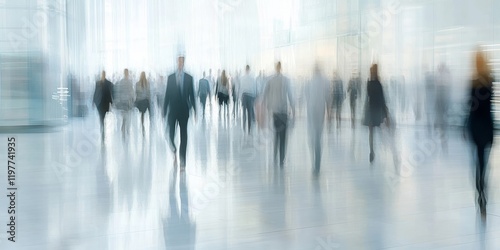 Businesspeople walking at modern office. Group of business employees at coworking center. Motion blur. Concept work process. Wide image, Generative AI