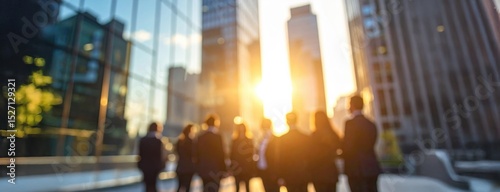 Businesspeople walking through a modern cityscape during golden hour symbolizing corporate life and economic ambition