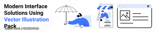 Businessperson holding umbrella, mobile shopping interface, webpage design layout. Ideal for e-commerce, marketing, subscription service, brand identity, UIUX, creative ads flat landing page banner
