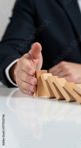 Businessperson stopping falling wooden blocks with hand, illustrating risk management and prevention in financial decision making