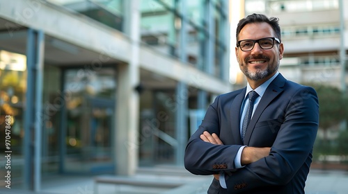 Businessperson with arms crossed outside office building, smiling, portrait shot, copy space, plain background