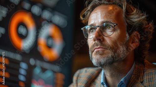 Businessperson with Hawk Head Pointing at Graph on Screen in Presentation Room with Copyspace on Left