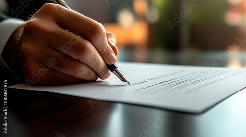 businesspersons hand is seen signing important document, showcasing professionalism and attention to detail in modern office setting. focus on pen and paper conveys sense of commitment and
