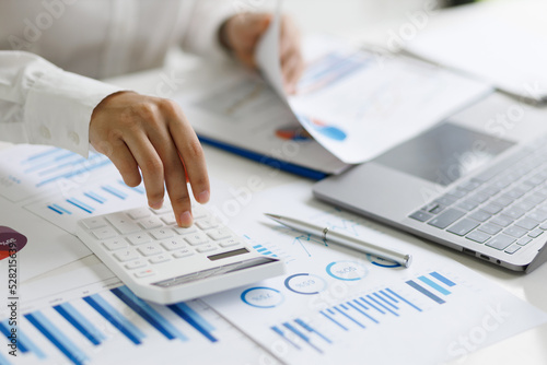 Businesswoman accountant or financial expert analyze business report graph and finance budget chart in the office. Concept of finance economy, banking business and stock market research.
