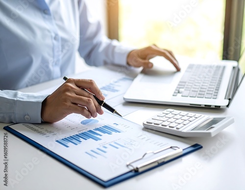 Businesswoman analyzing charts and graphs on a laptop