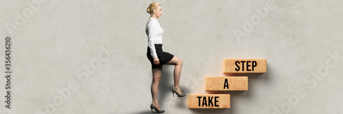 businesswoman and cubes with message TAKE A STEP on concrete background
