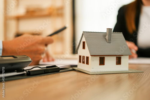 Businesswoman embraces client after successful property negotiation.