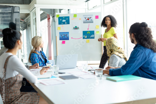 Businesswoman giving presentation on flip chart during meeting in a modern office