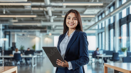 Businesswoman holding and using digital tablet in hand and looking with smile face in professional corporate company leader portrait in modern tech office workplace blur background