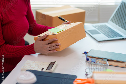 businesswoman in red shirt standing holding parcel box ready to deliver to customer who ordered products online via an online shopping application. Concept opening an online store via Application