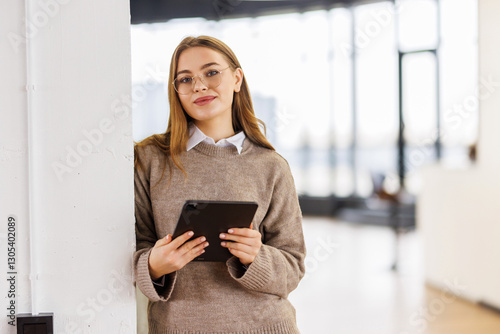 Businesswoman in the suit standing confidently holding iPad or tablet in hand and smiling in the office.