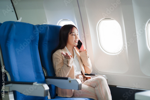 Businesswoman on a Business Trip: A young, stylish businesswoman in a beige blazer and pants sits in an airplane seat, engrossed in a phone call, showcasing the modern, professional.