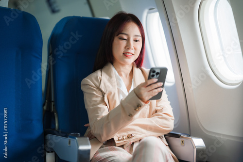 Businesswoman on a Plane: A professional woman, clad in a stylish beige suit, casually browses her smartphone while seated in an airplane cabin.