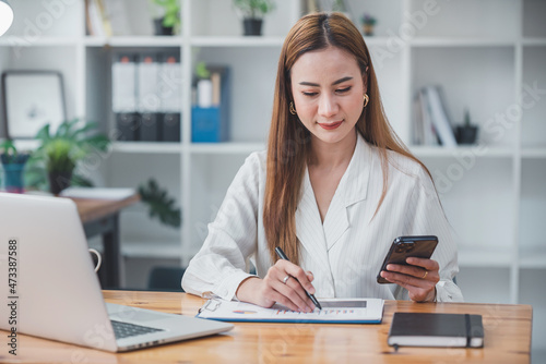 Businesswoman or accountant using the phone to check business information. Accounting Documents and Laptop at Small Office Business Ideas