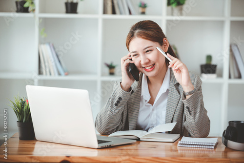 Businesswoman or accountant using the phone to check business information. Accounting Documents and Laptop at Small Office Business Ideas