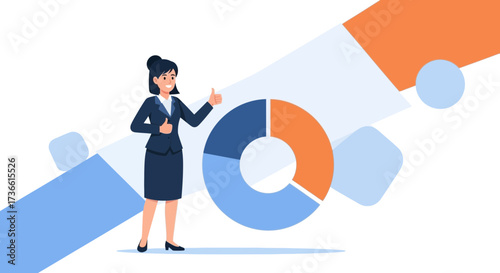 Businesswoman Presenting a Pie Chart, Illustrating Data Analysis and Success, Thumb Up Sign