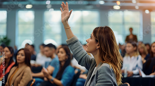 Businesswoman raising hand to ask question attending seminar in conference hall.