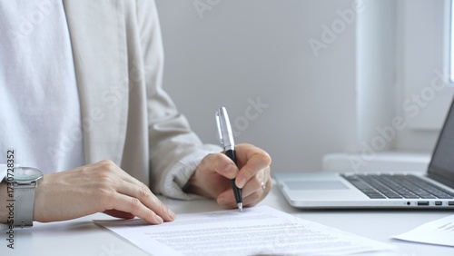 Businesswoman signing a contract at office desk, surrounded by a laptop and documents, exemplifies focus and commitment. Business people