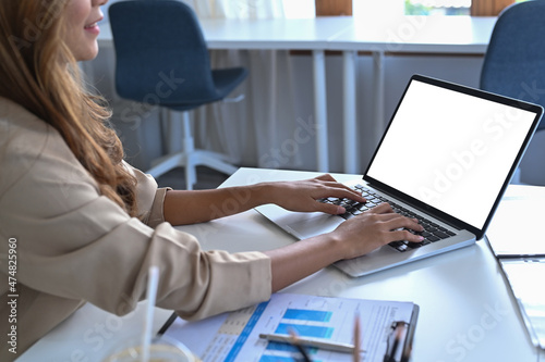 Businesswoman sitting at her office desk and using laptop computer.