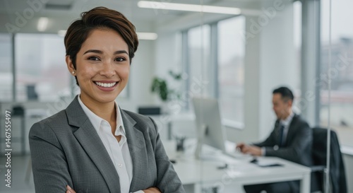 Businesswoman smiles in office with coworker at desk and large windows.
