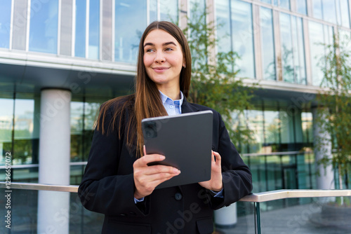 Businesswoman stands confidently outside a modern office building holding a tablet during daytime