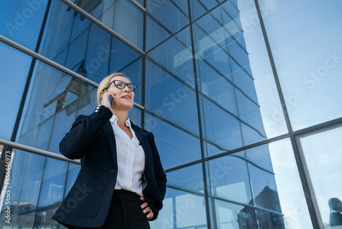 Businesswoman talking on mobile phone by office building