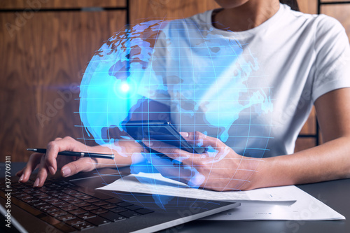 Businesswoman typing on laptop in office. Planet earth world map hologram. International business concept. Double exposure.