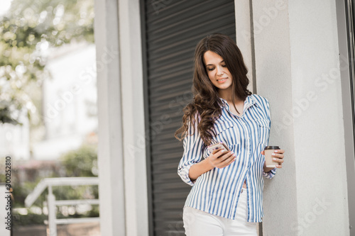 Businesswoman uses a phone, walking along the city streets with coffee in her hand.