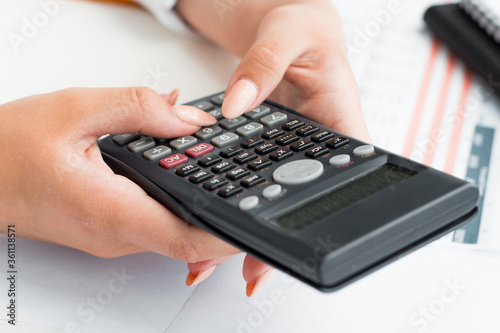 Businesswoman using a calculator to calculate the numbers