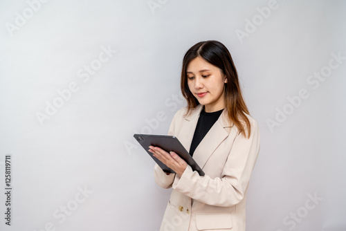 Businesswoman Using Digital Tablet with Stylus for Work,Professional Woman Writing on a Tablet in a Corporate Setting
