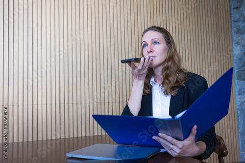 Businesswoman Using Voice Command While Reviewing Documents in a Modern Office