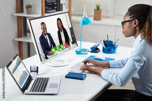 Businesswoman Videoconferencing With Her Colleagues