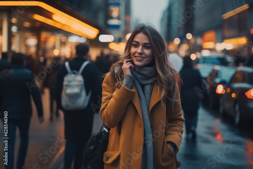 Businesswoman walking on the sidewalk talking on cell phone downtown.