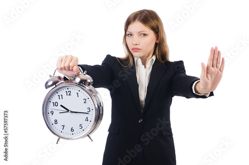 Businesswoman with clock isolated on white