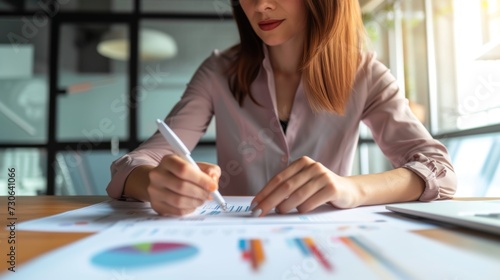 Businesswoman with paper drawing marketing plan paper for planning creative advertising ideas and thinking of reminders on board. A businesswoman with plan for startup company at work