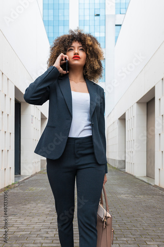 Businesswoman with purse talking on smart phone while walking amidst office buildings