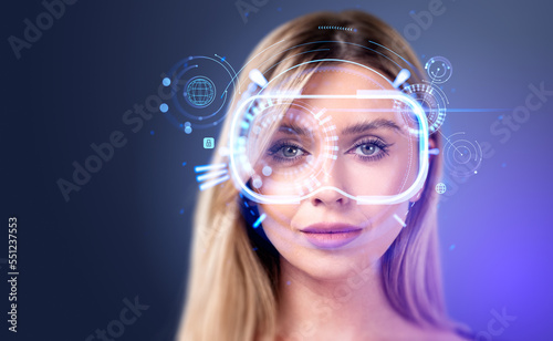 Businesswoman with vr glasses hologram, futuristic technology and metaverse