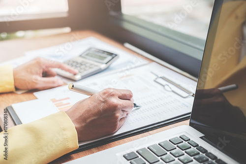 Businesswoman working at his coffee shop and using laptop, discussing the charts and graphs showing the results of their successful.