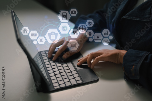 Businesswoman working on digital tablet to defend customer. Internet security and secured access concept