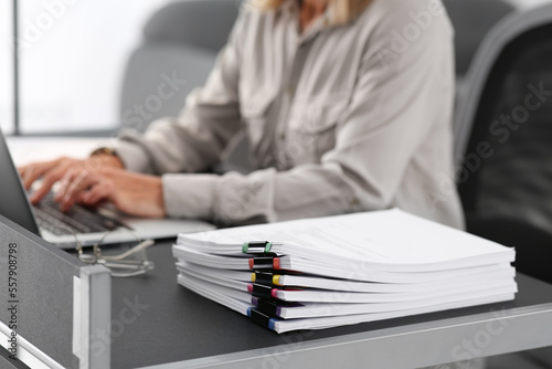 Businesswoman working with laptop at grey table in office, focus on documents. Space for text