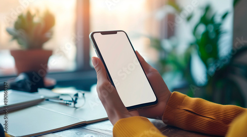 Businesswoman's hand using a smartphone with a blank screen for copy space