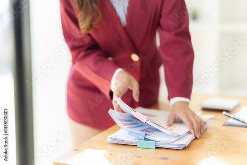 Businesswoman's hands working in pile of papers to find information on table, documents, business reports. Close-up image of financial business concept.